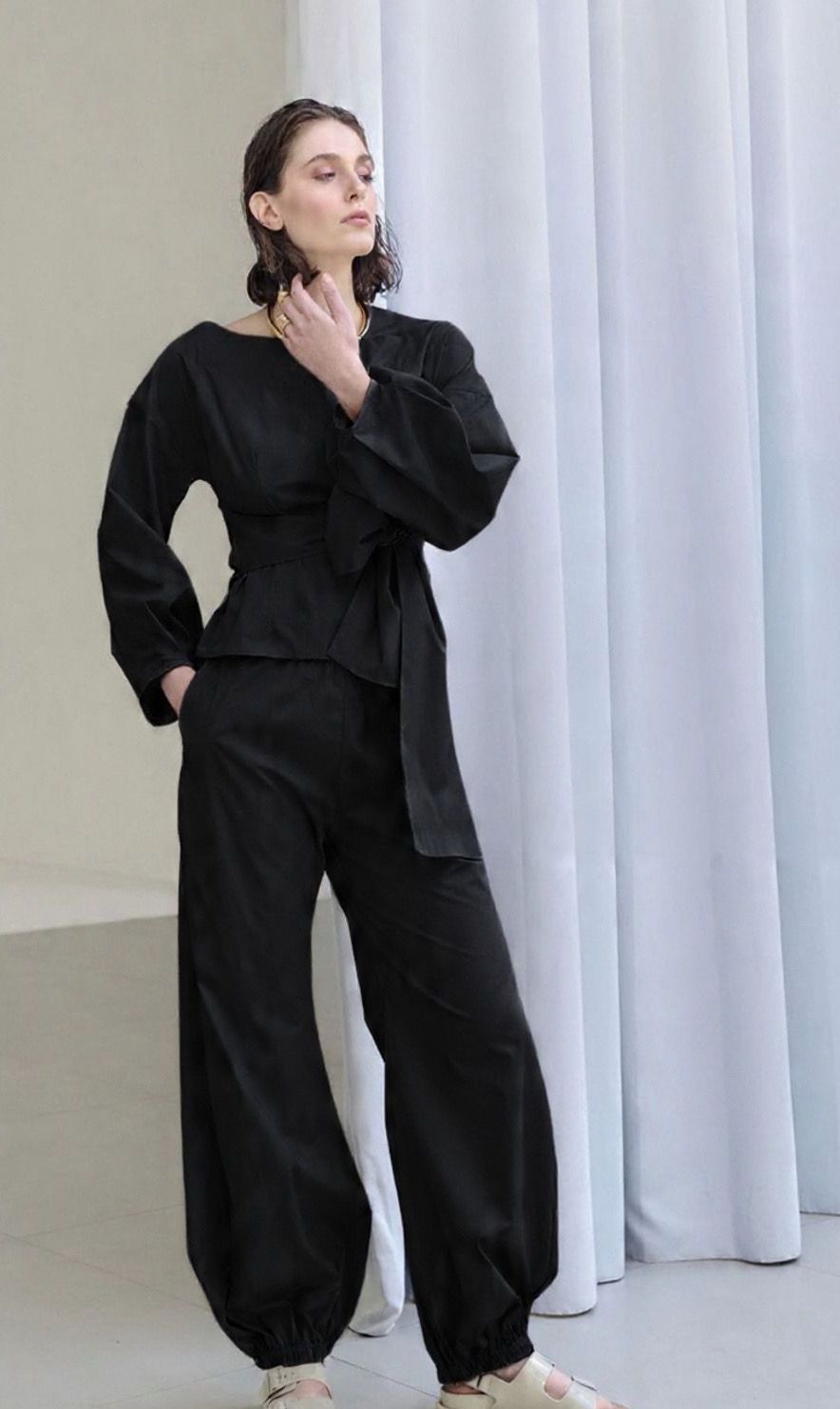 Calça em tricoline, com modelagem levemente volumosa. Possui bolsos laterais, elástico na cintura e barra.