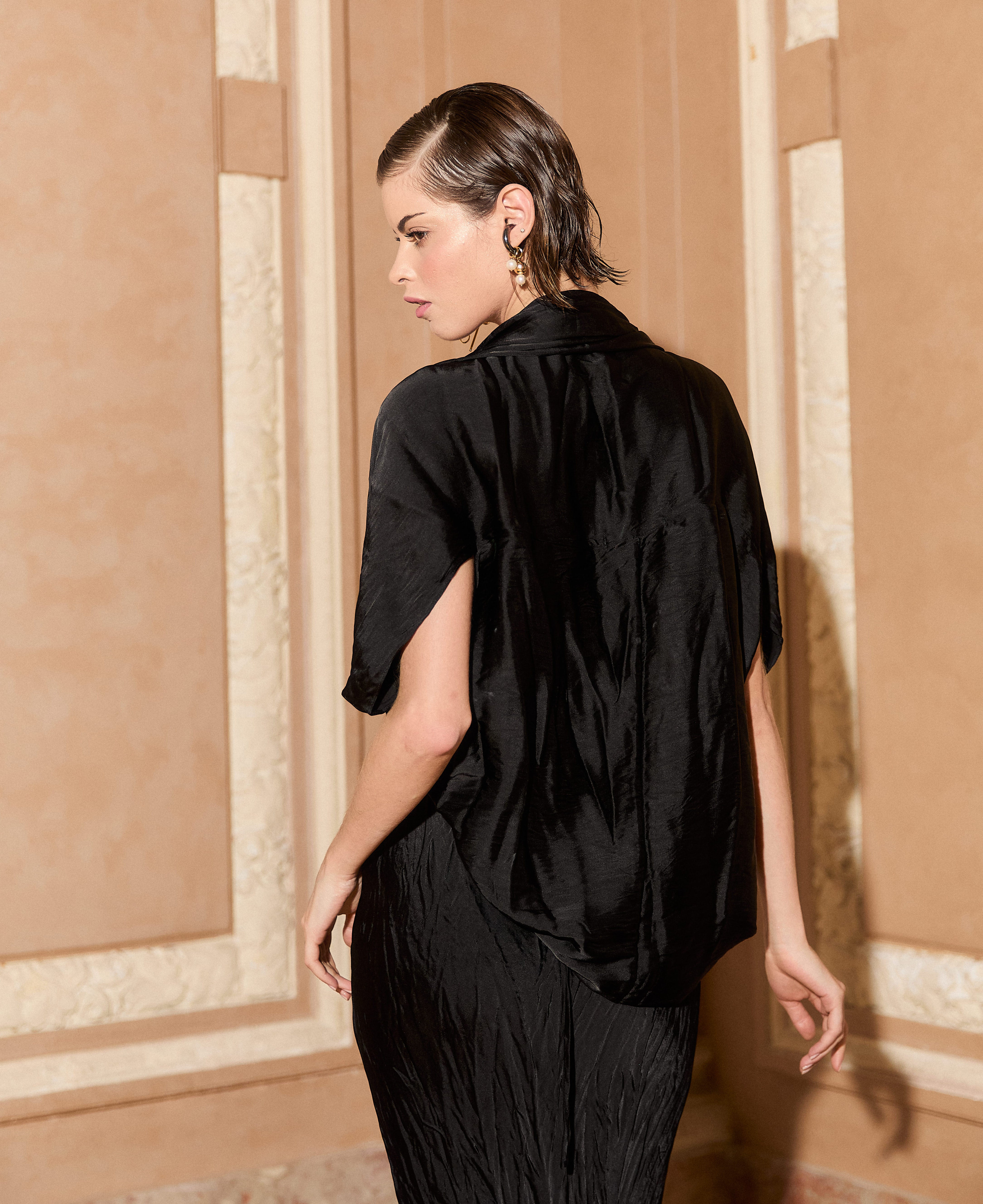Peça para sobreposição em cetim amassado. Acabamento em bainha de lenço.