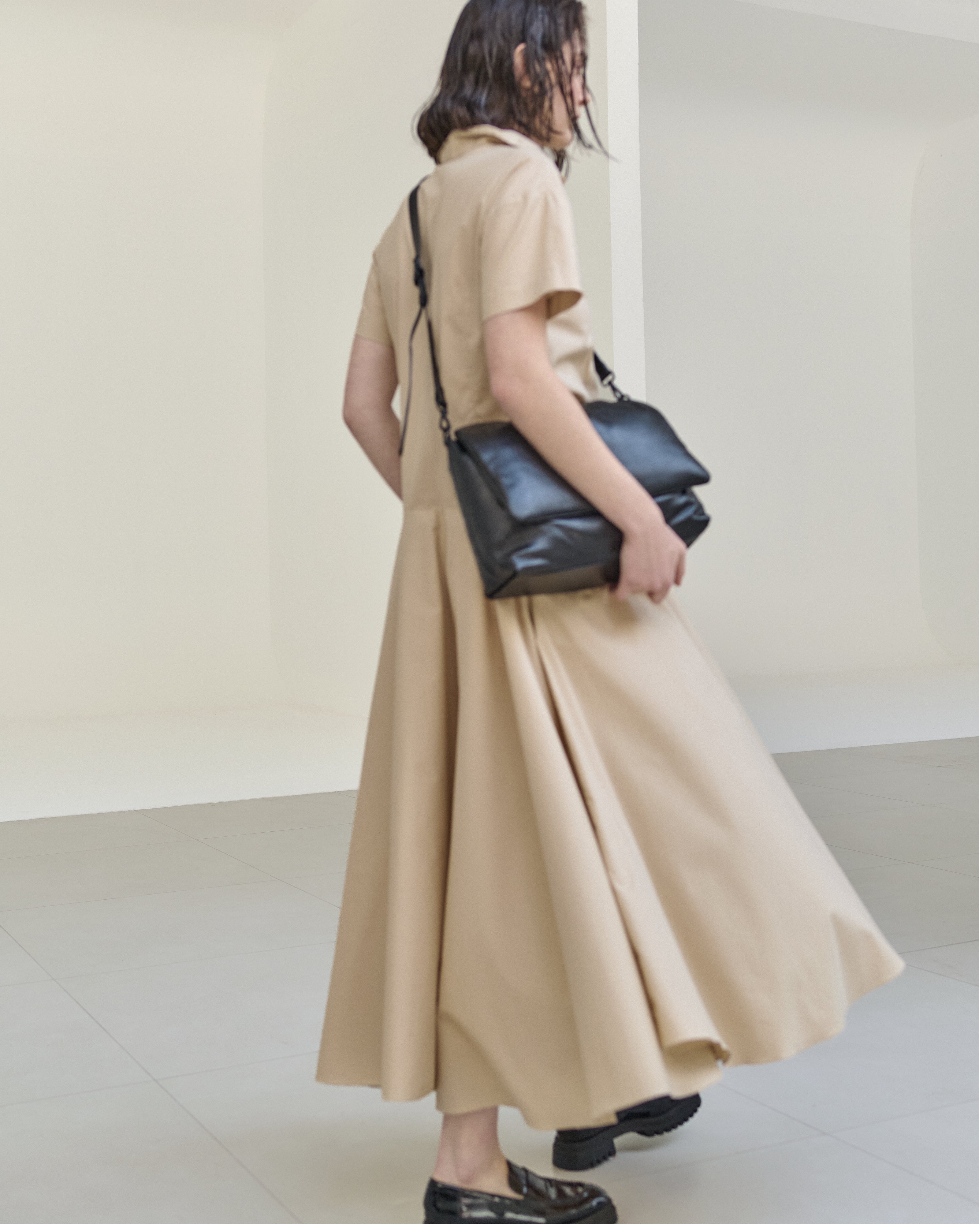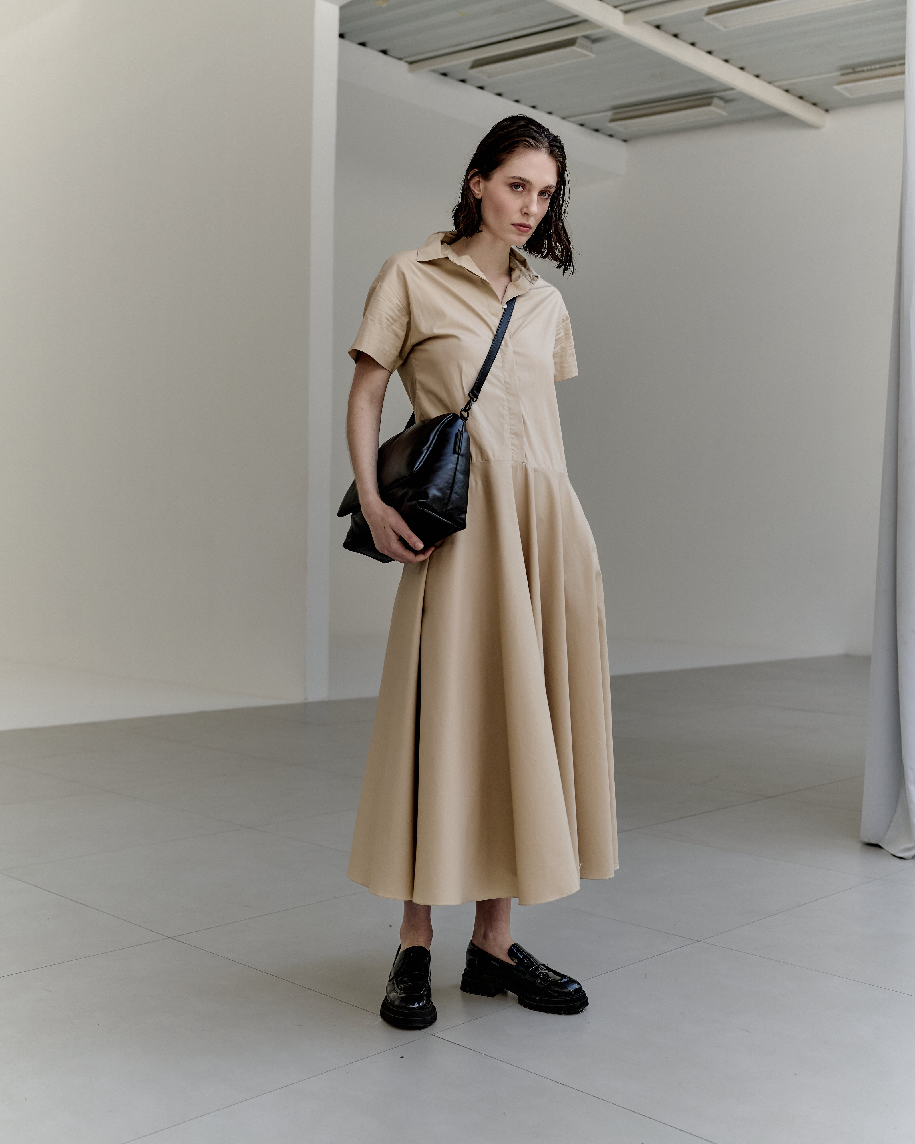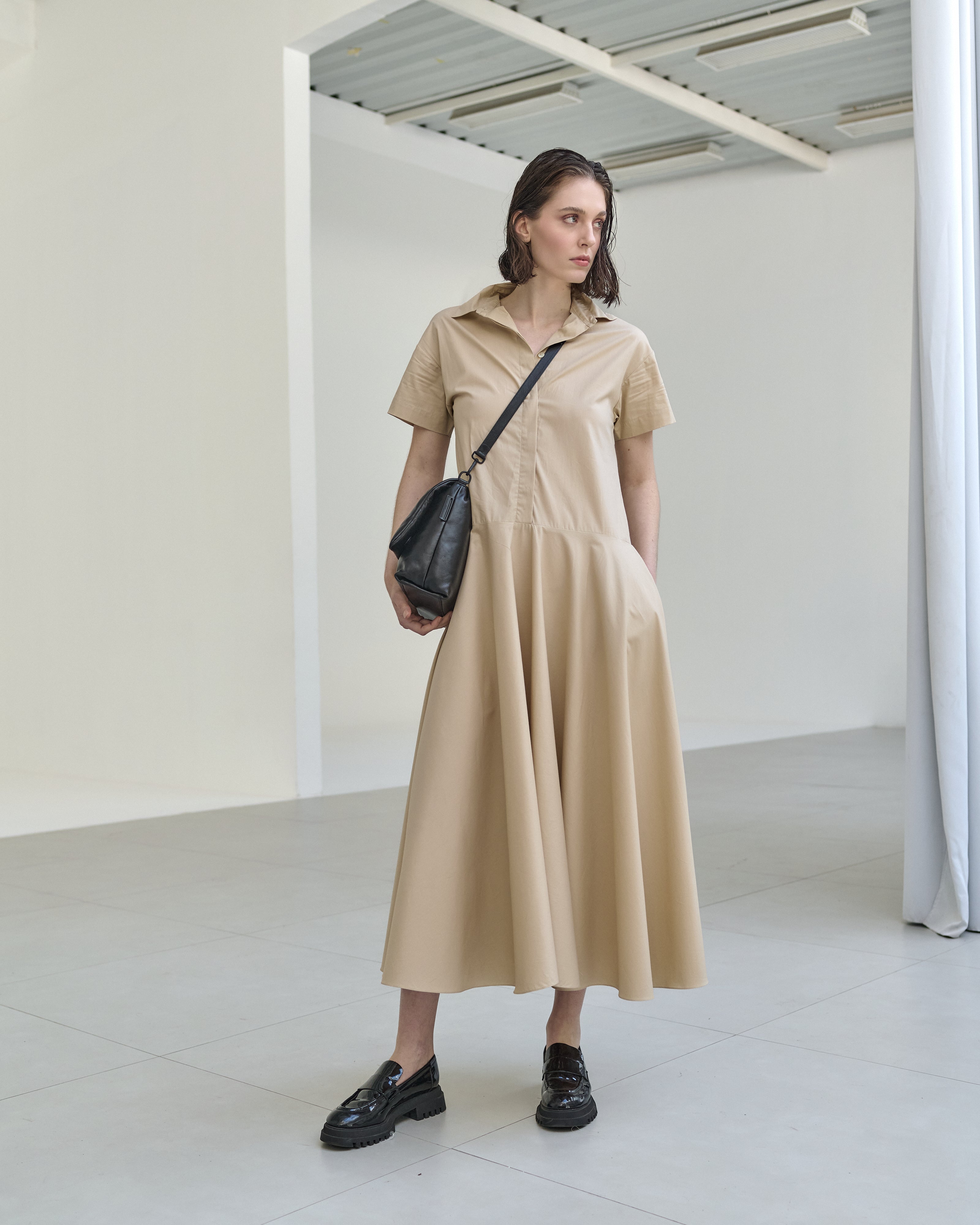 Chemisier com manga curta e saia godê. Possui bolsos laterais, pences nas costas e abotoamento embutido.