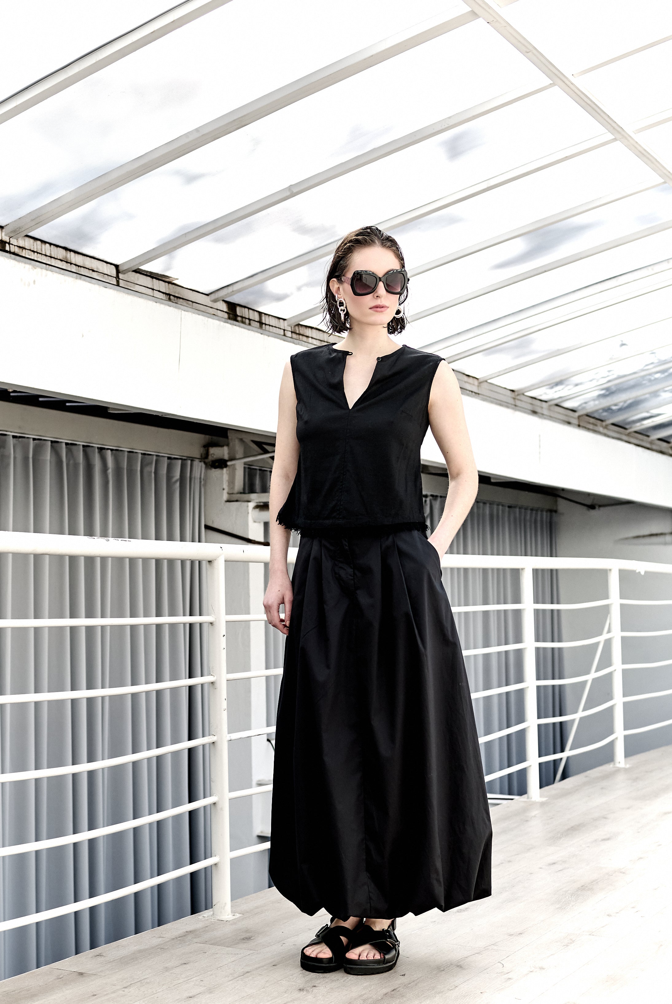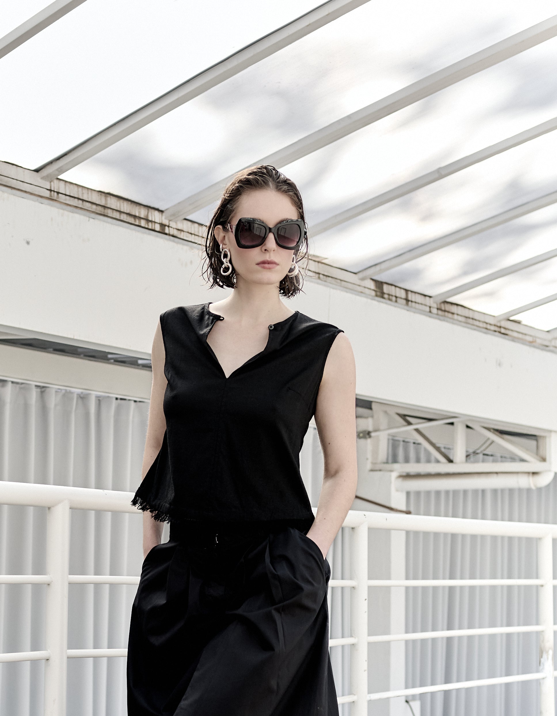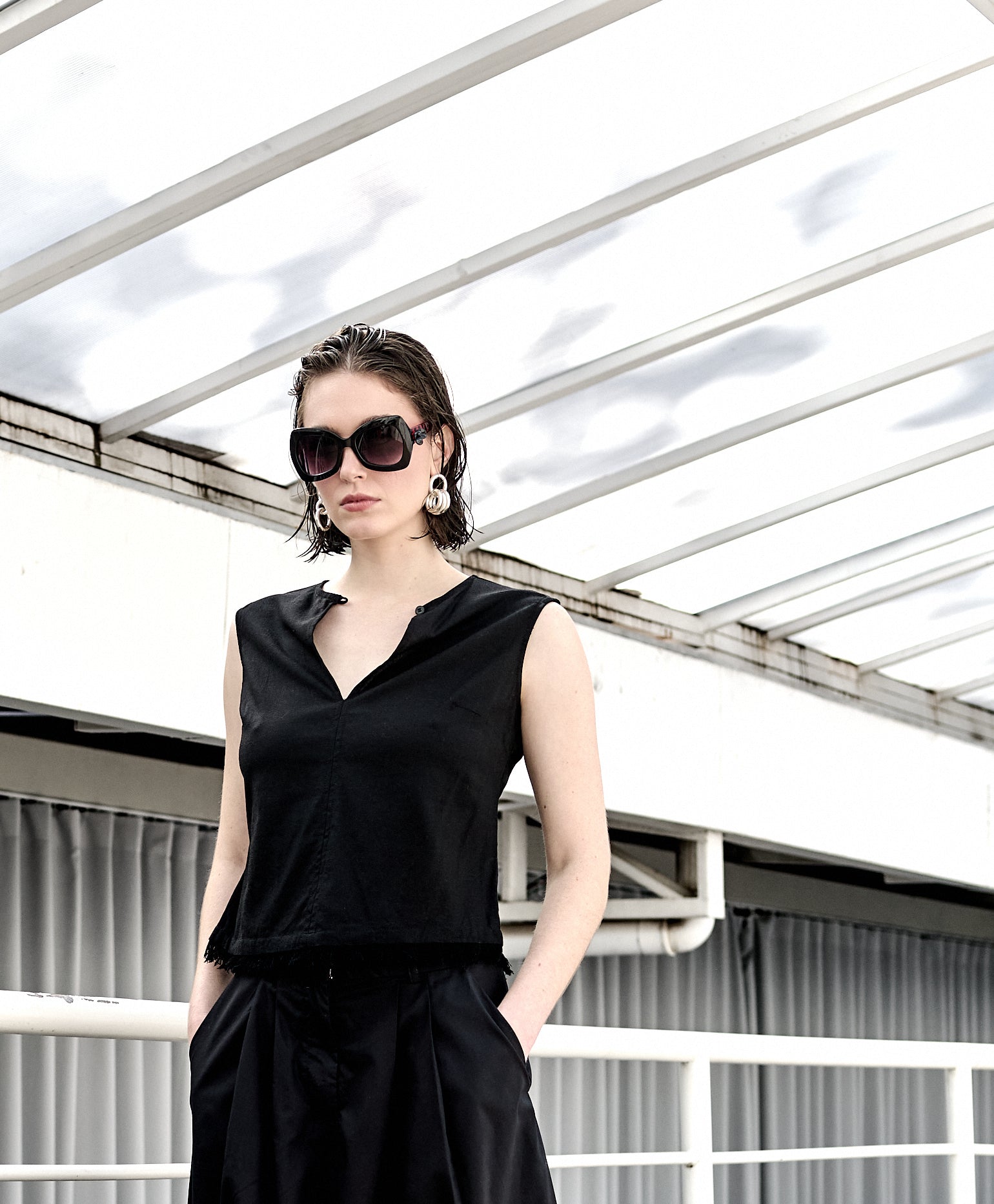 Blusa em linho misto sem mangas, com decote arredondado e abertura frontal com fechamento por botão. Possui pences nas costas, e barra desfiada manualmente.