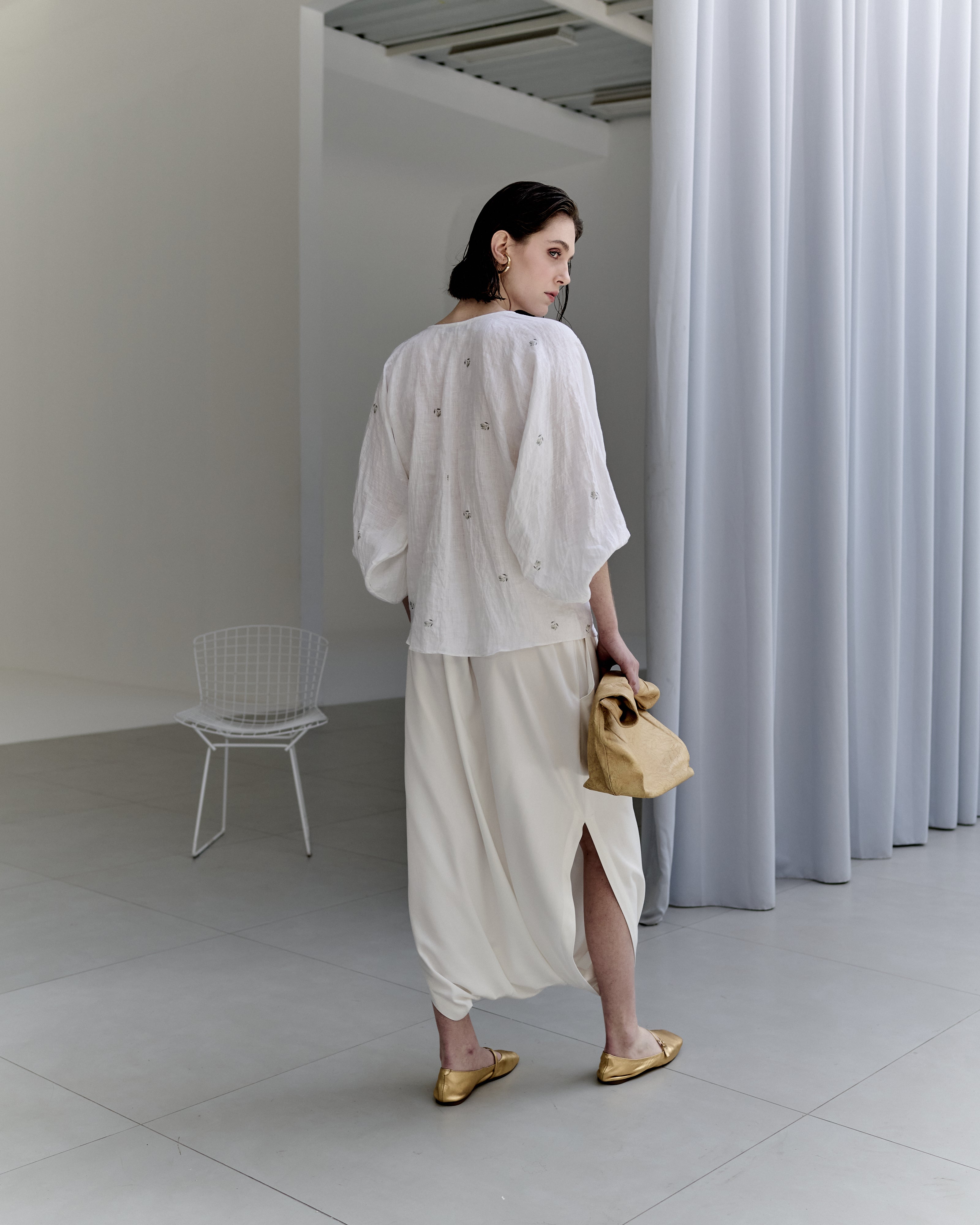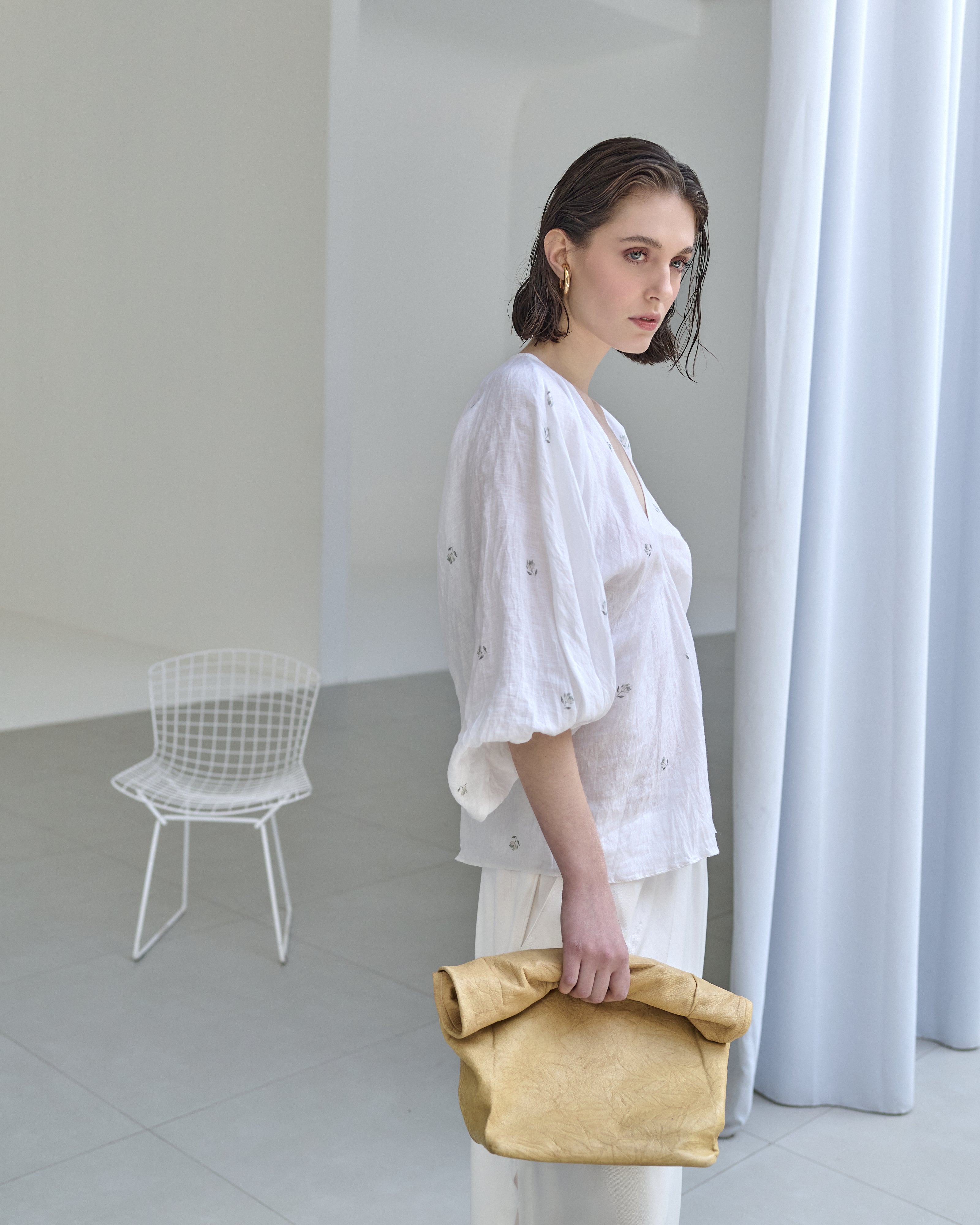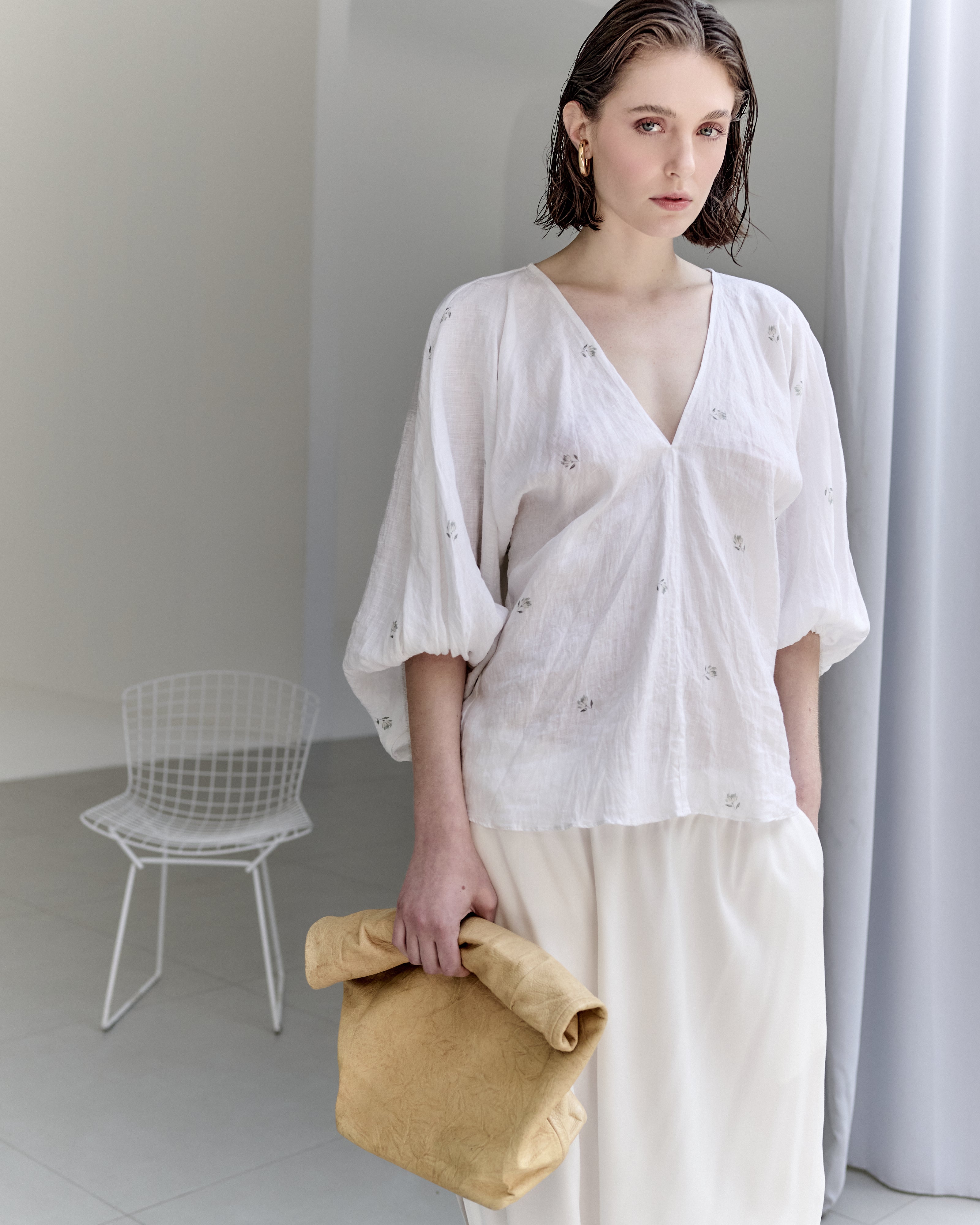 Blusa fluida com decote V e mangas longas amplas com elástico no punho. Apresenta recorte nas costas.