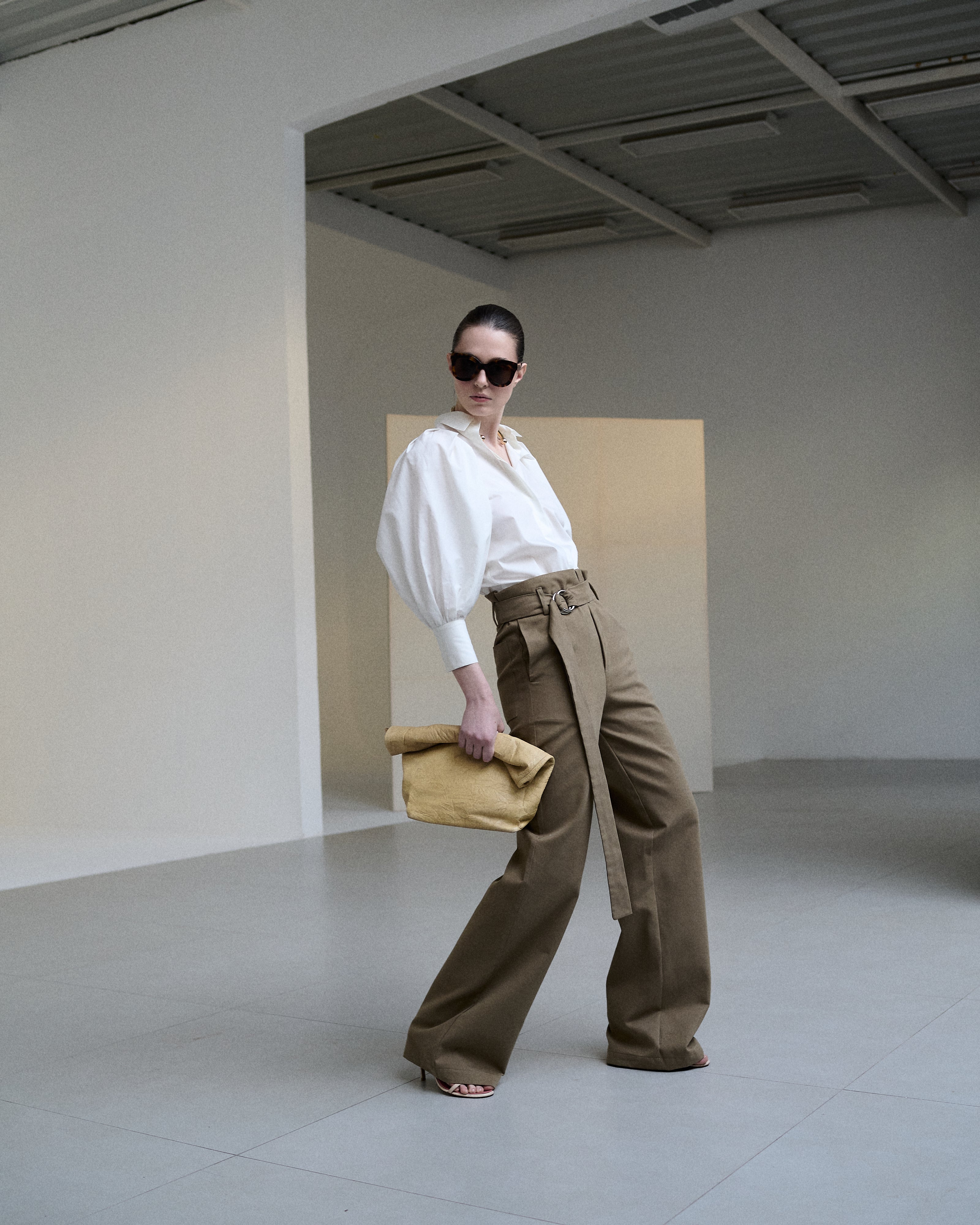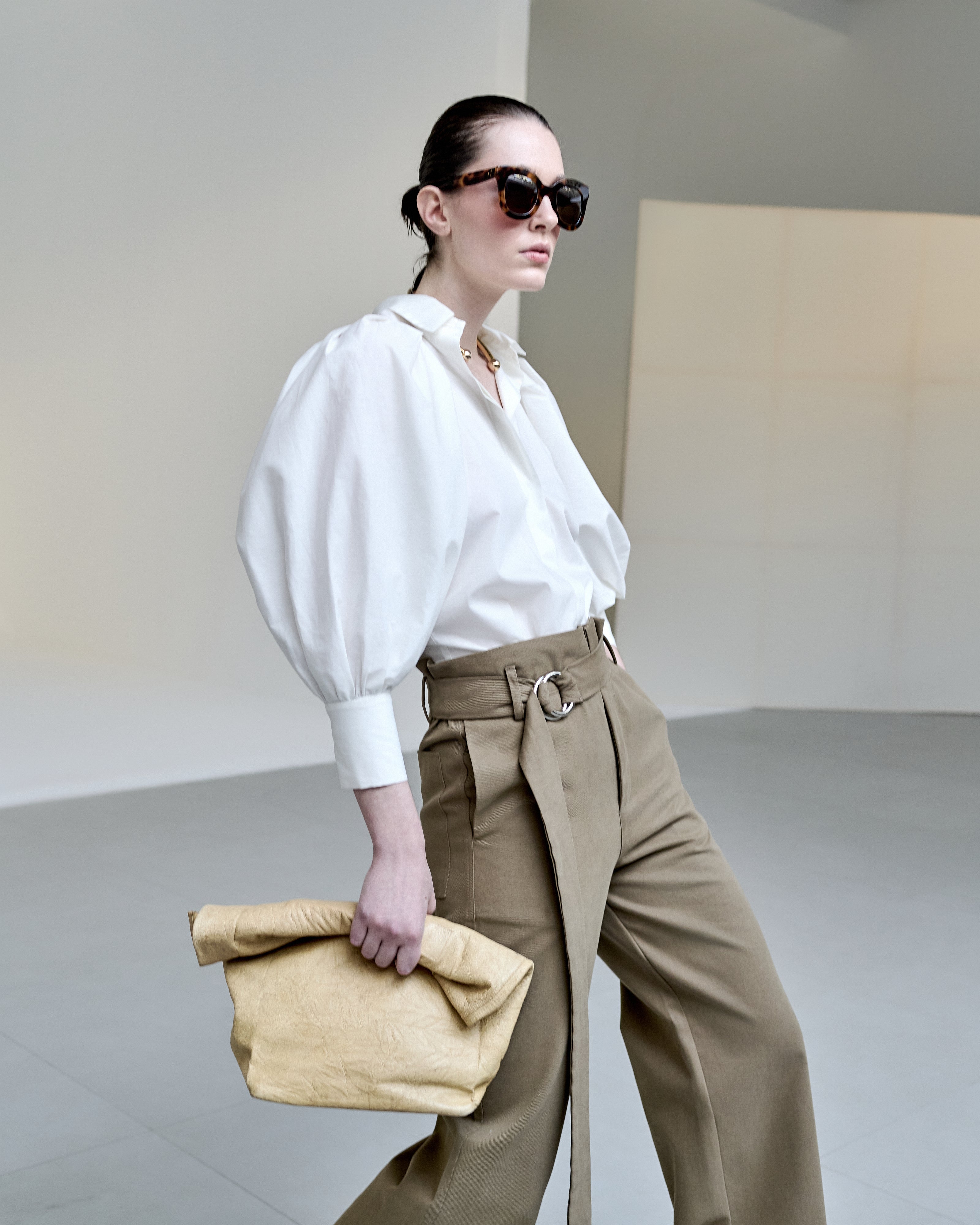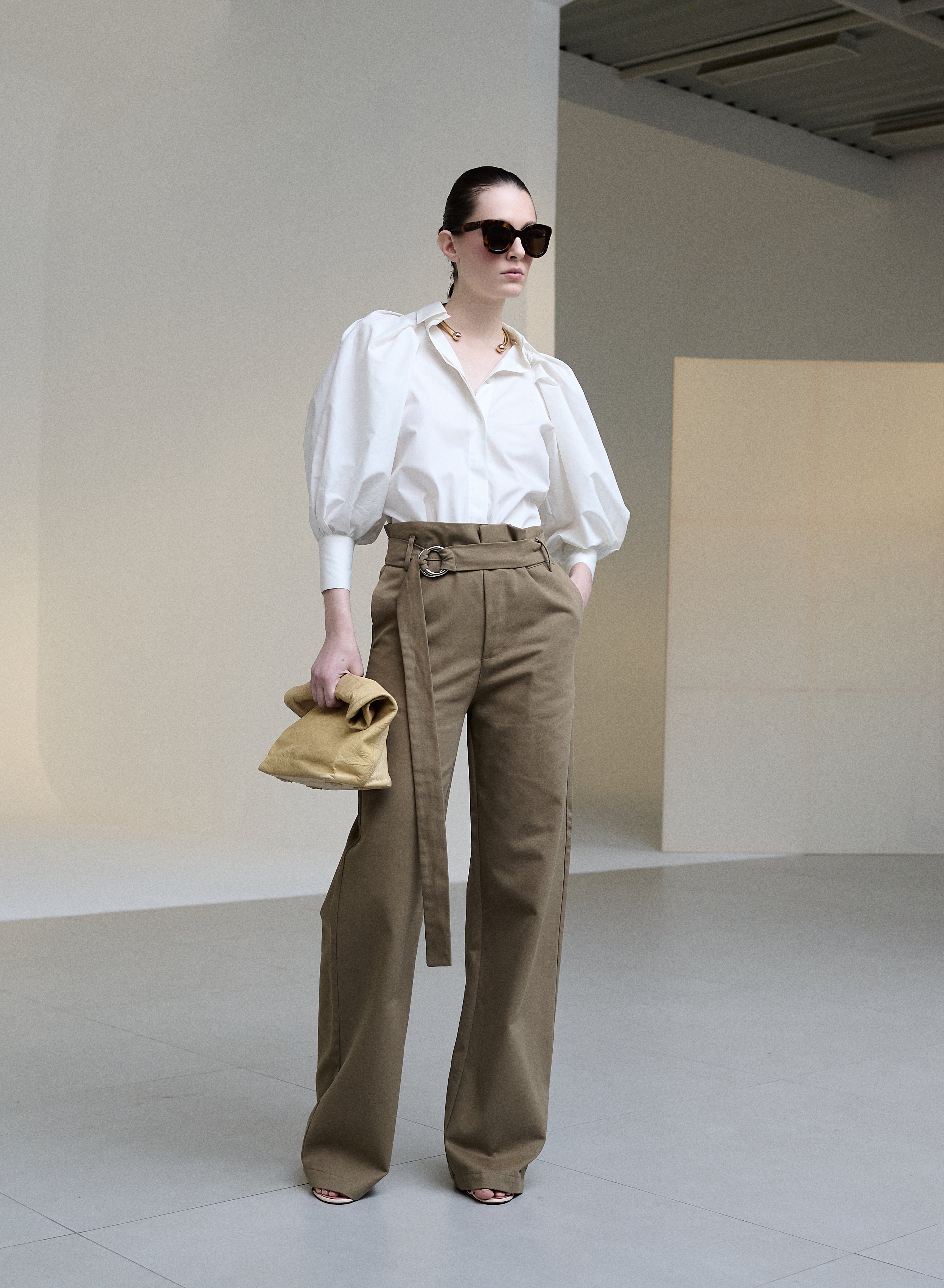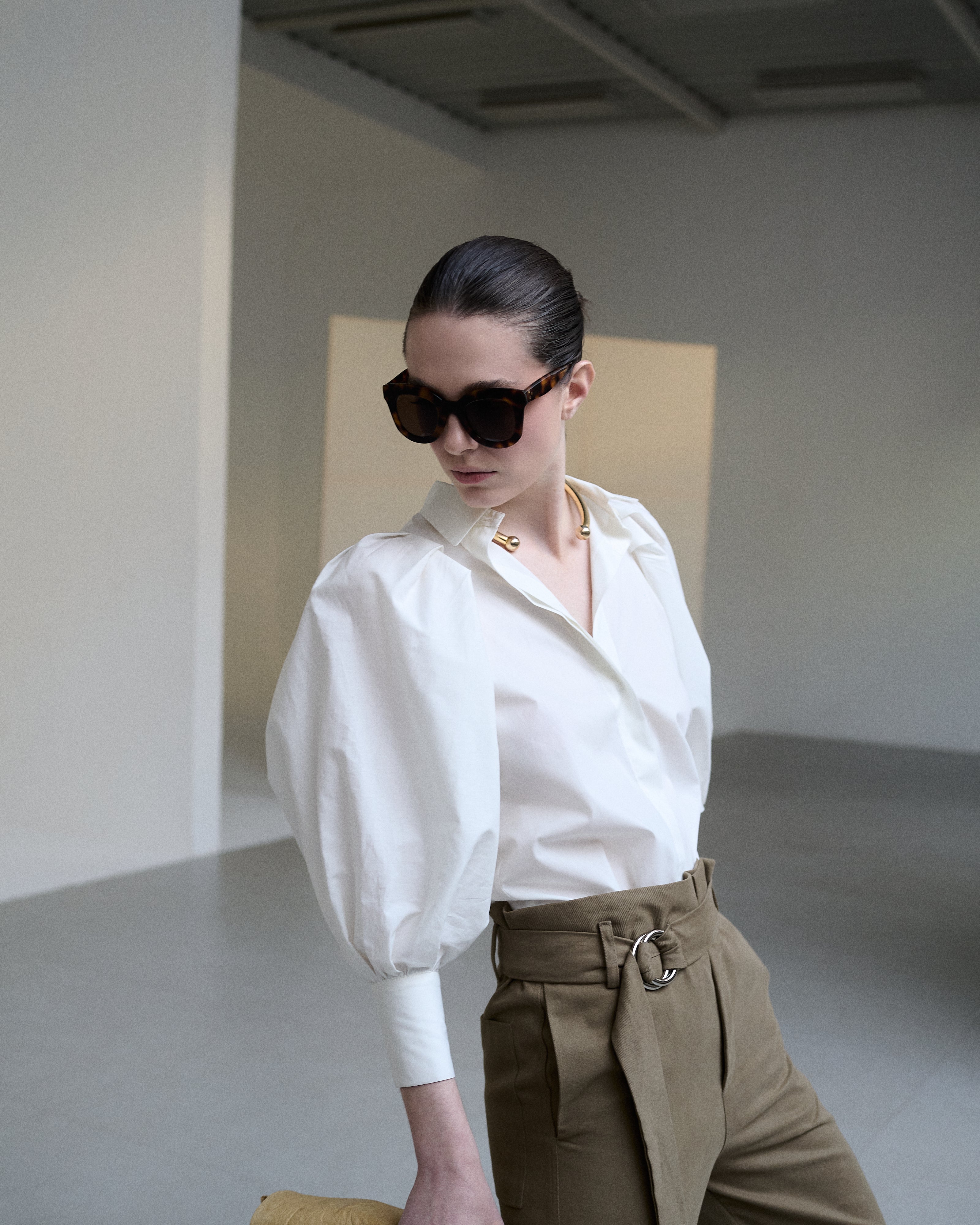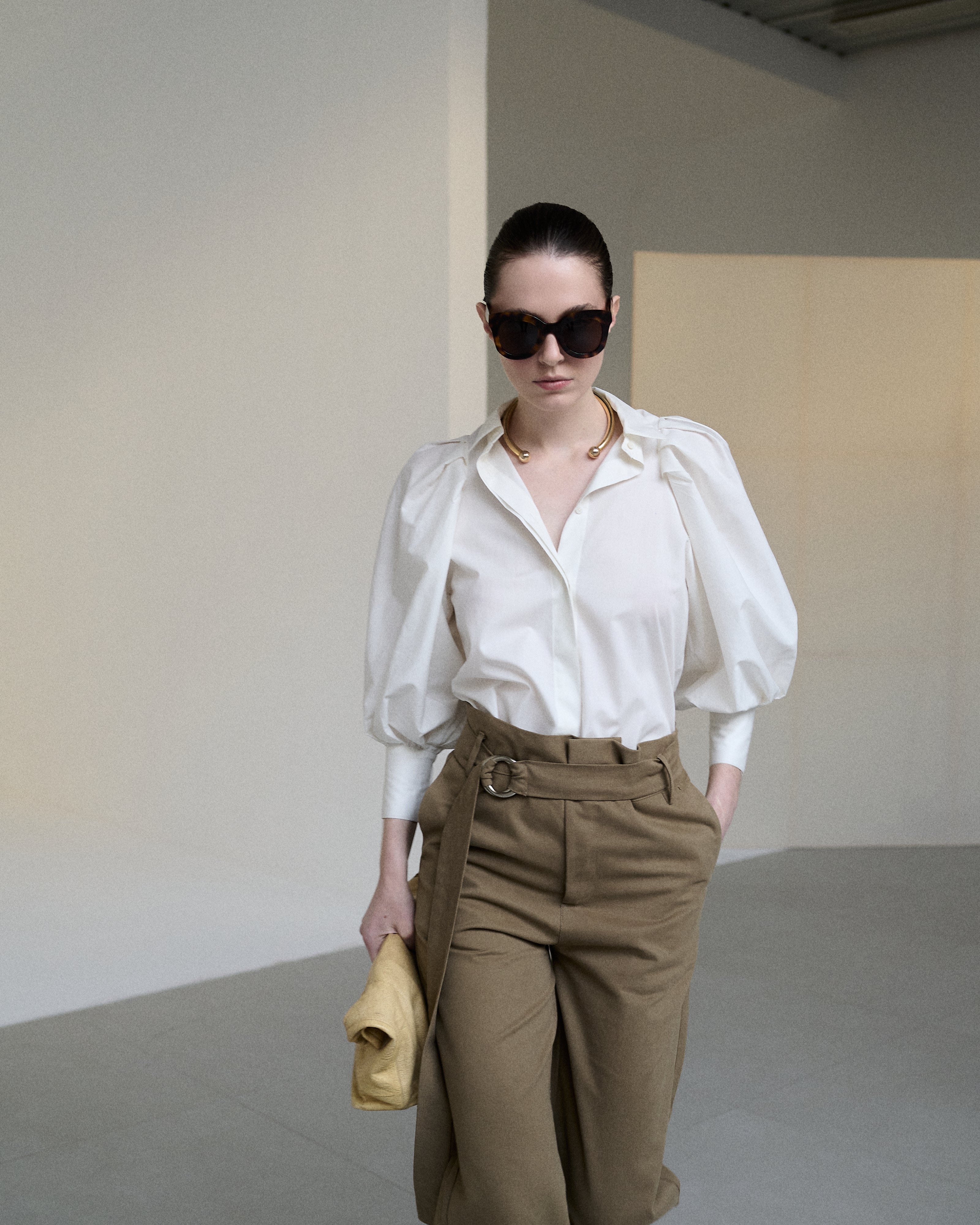 Camisa com mangas 3/4 bem volumosas, criadas por pregas nos ombros e no punho. Possui abotoamento frontal embutido, além de pala e prega nas costas.