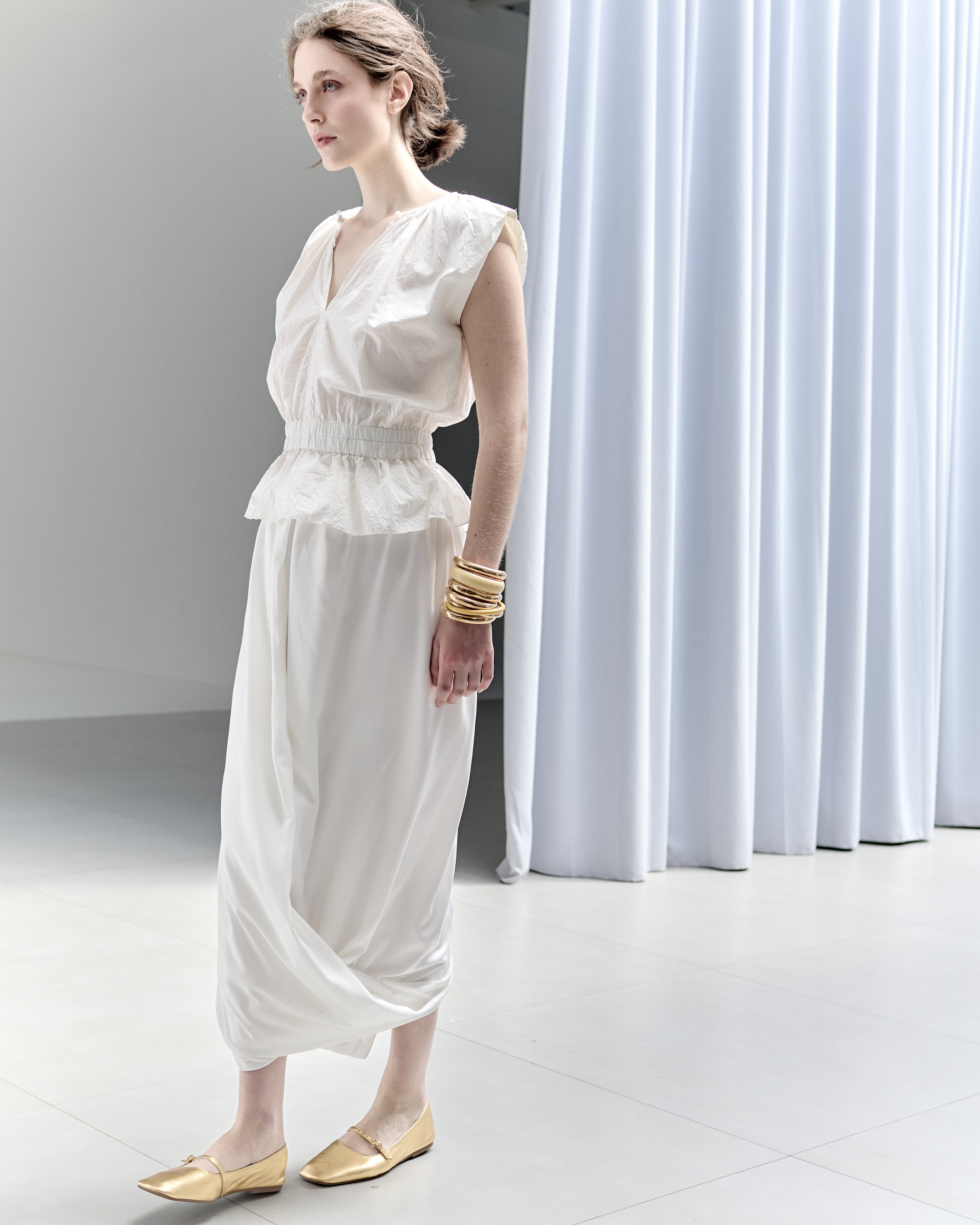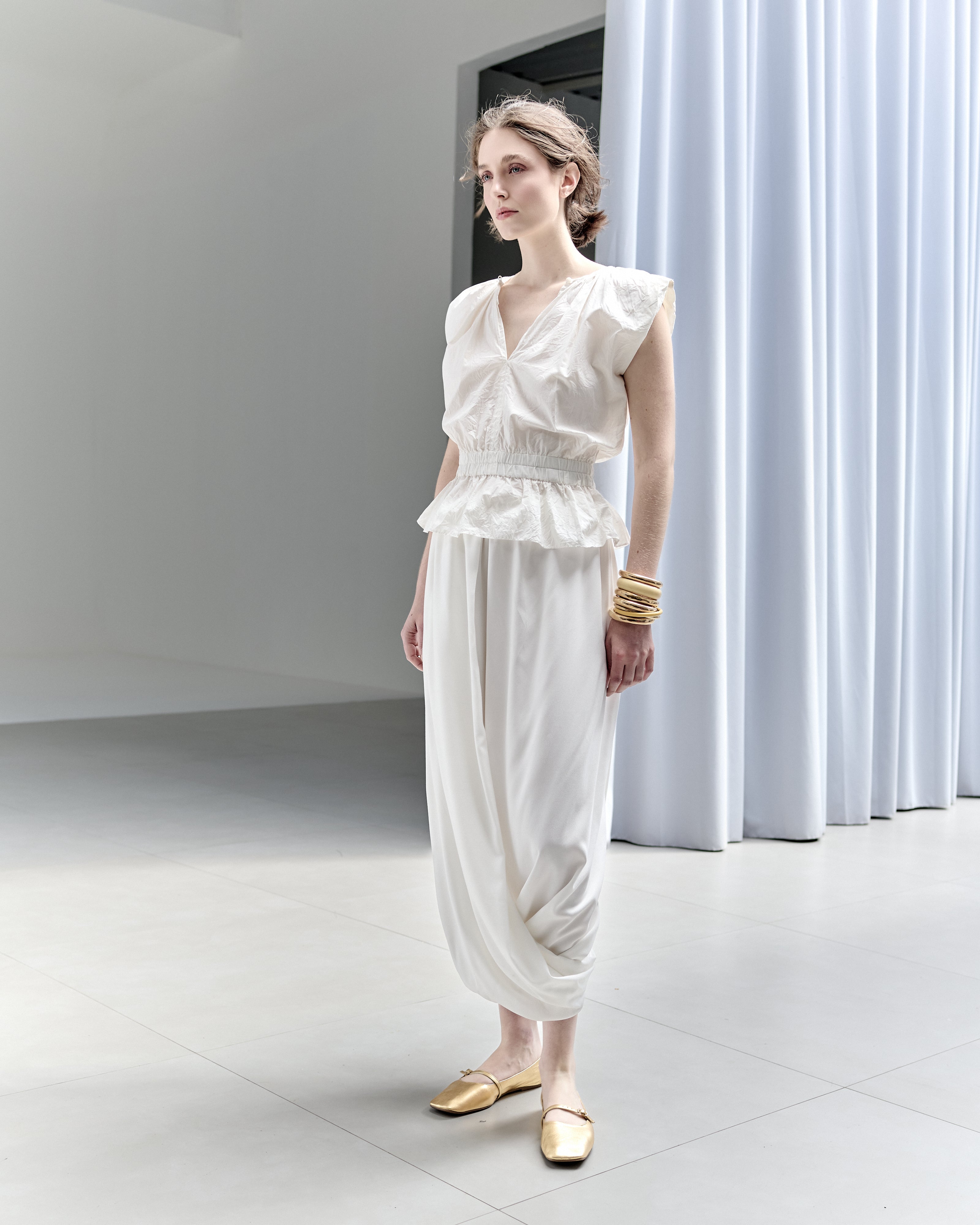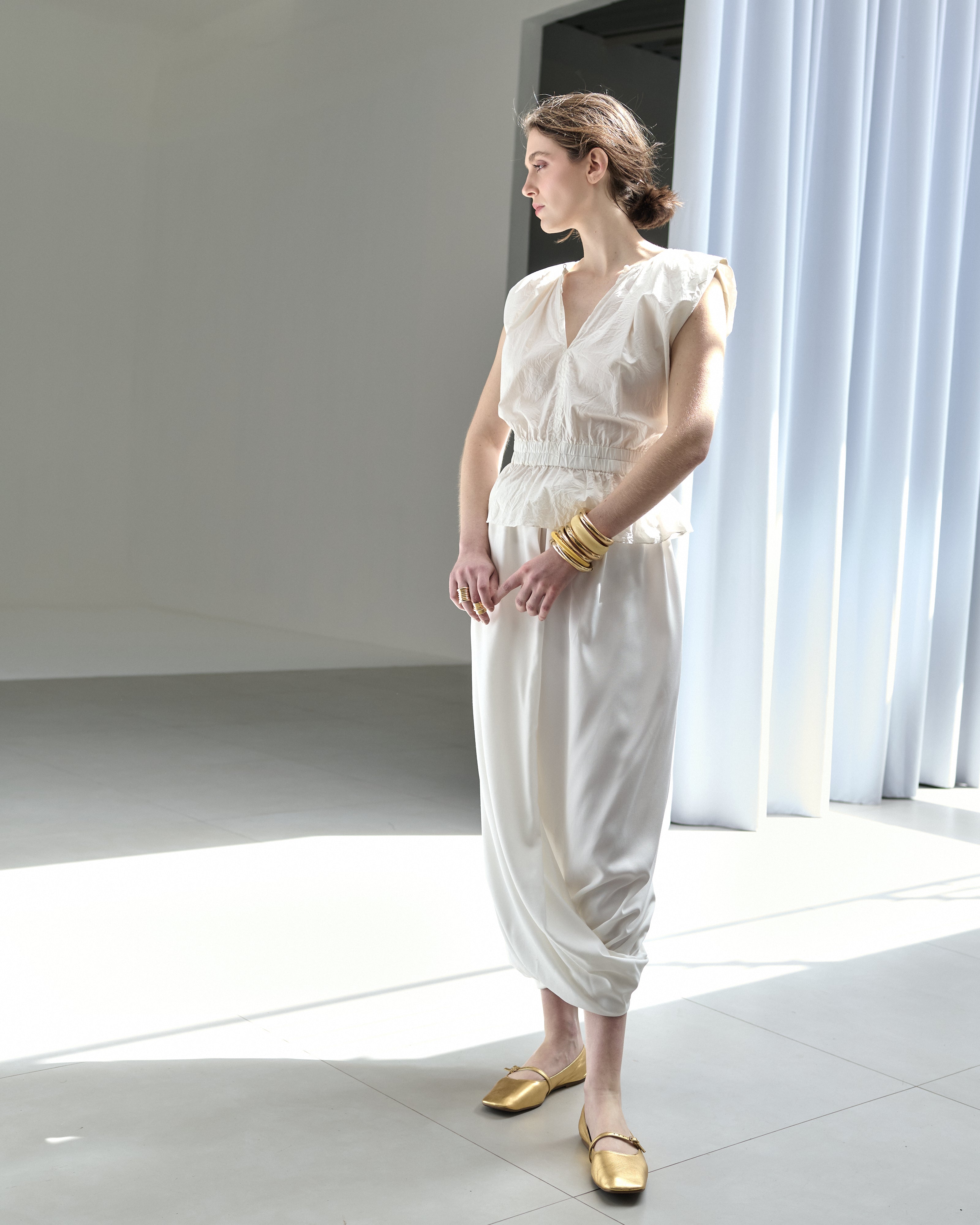 Saia com cós em elástico, confeccionada pelo processo de moulage que cria efeito torcido. Possui fenda nas costas, trazendo movimento à peça