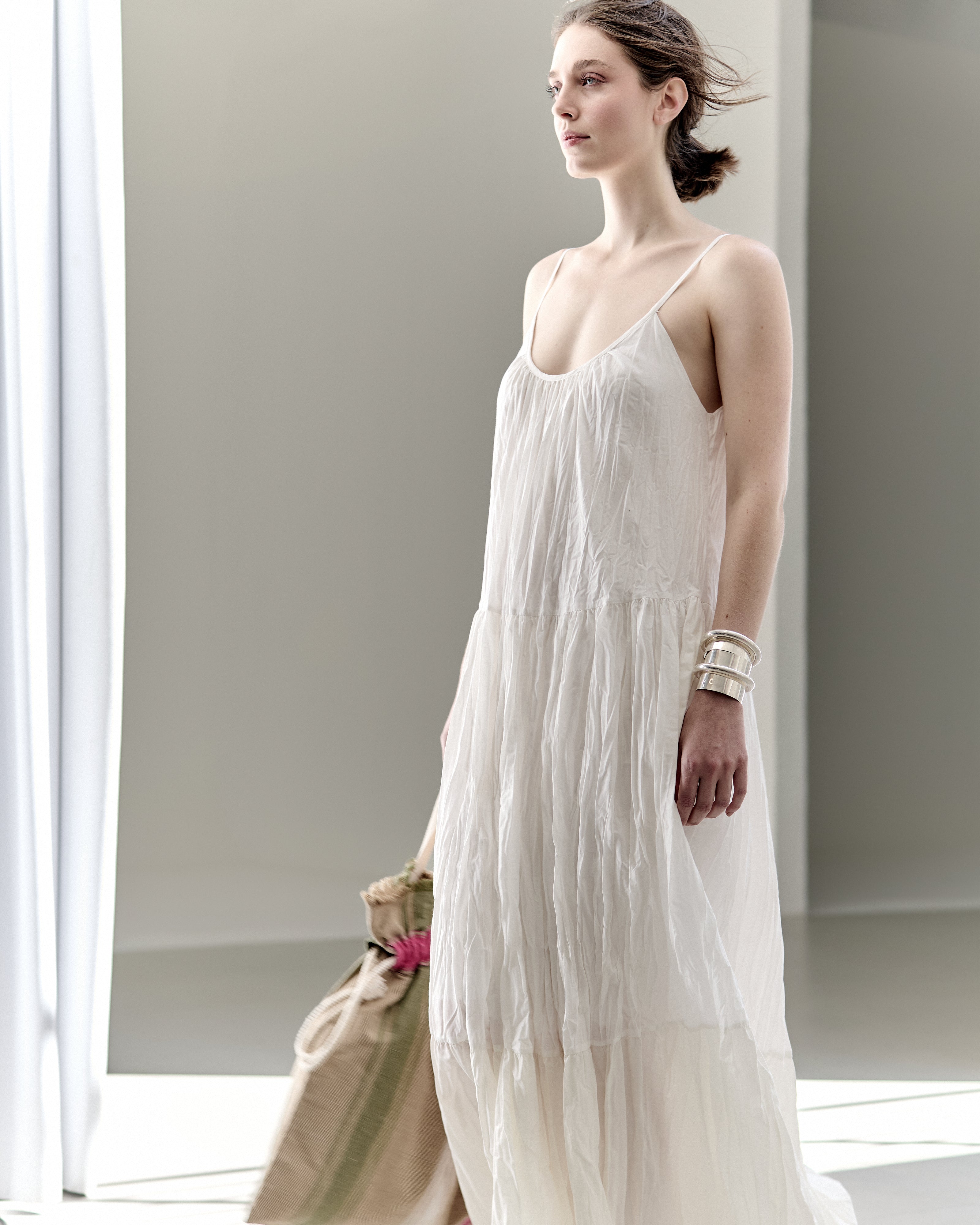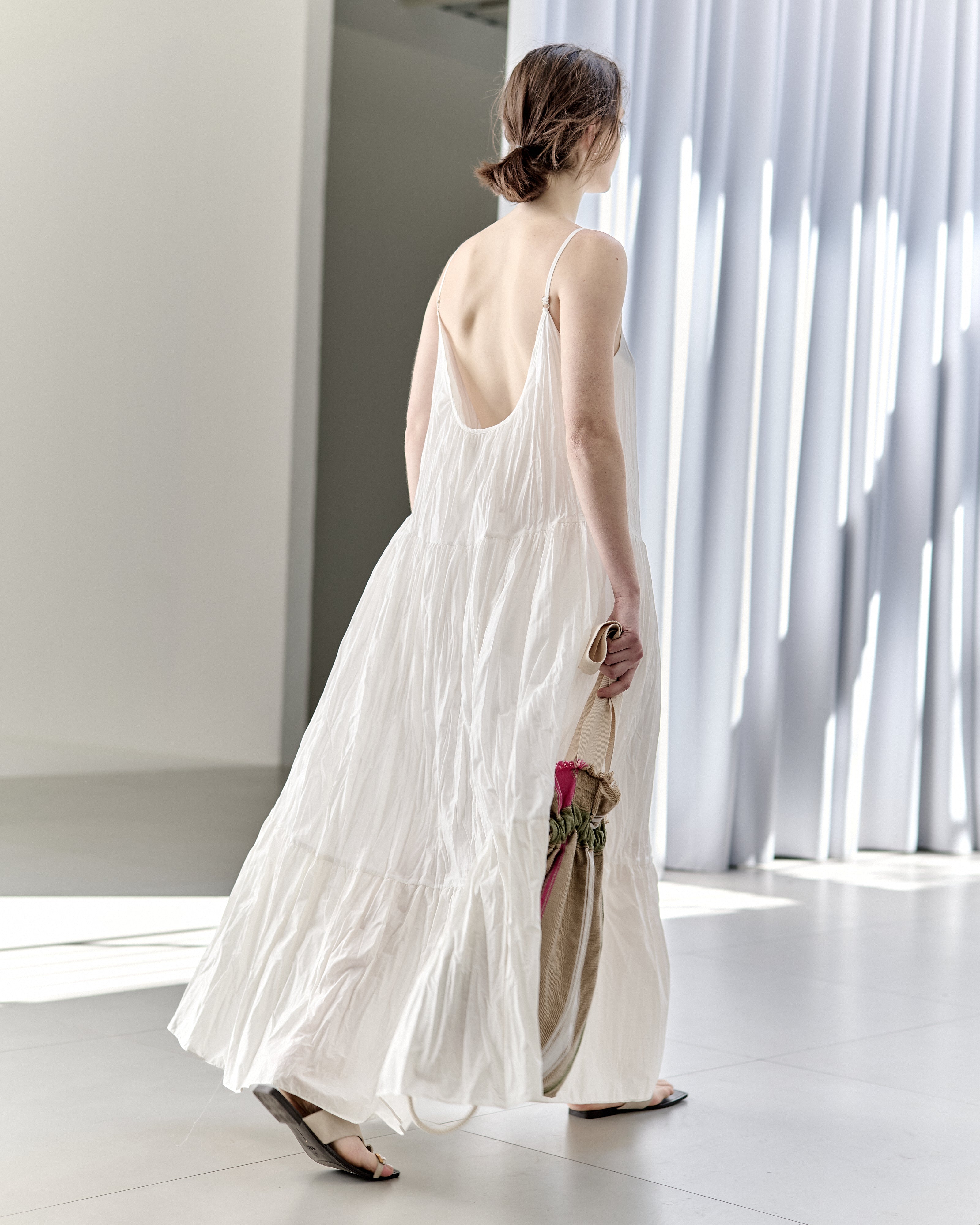 Vestido longo com alças reguláveis. Decote e recortes são levemente franzidos, acrescentando movimento delicado à peça. Possui decote baixo nas costas.