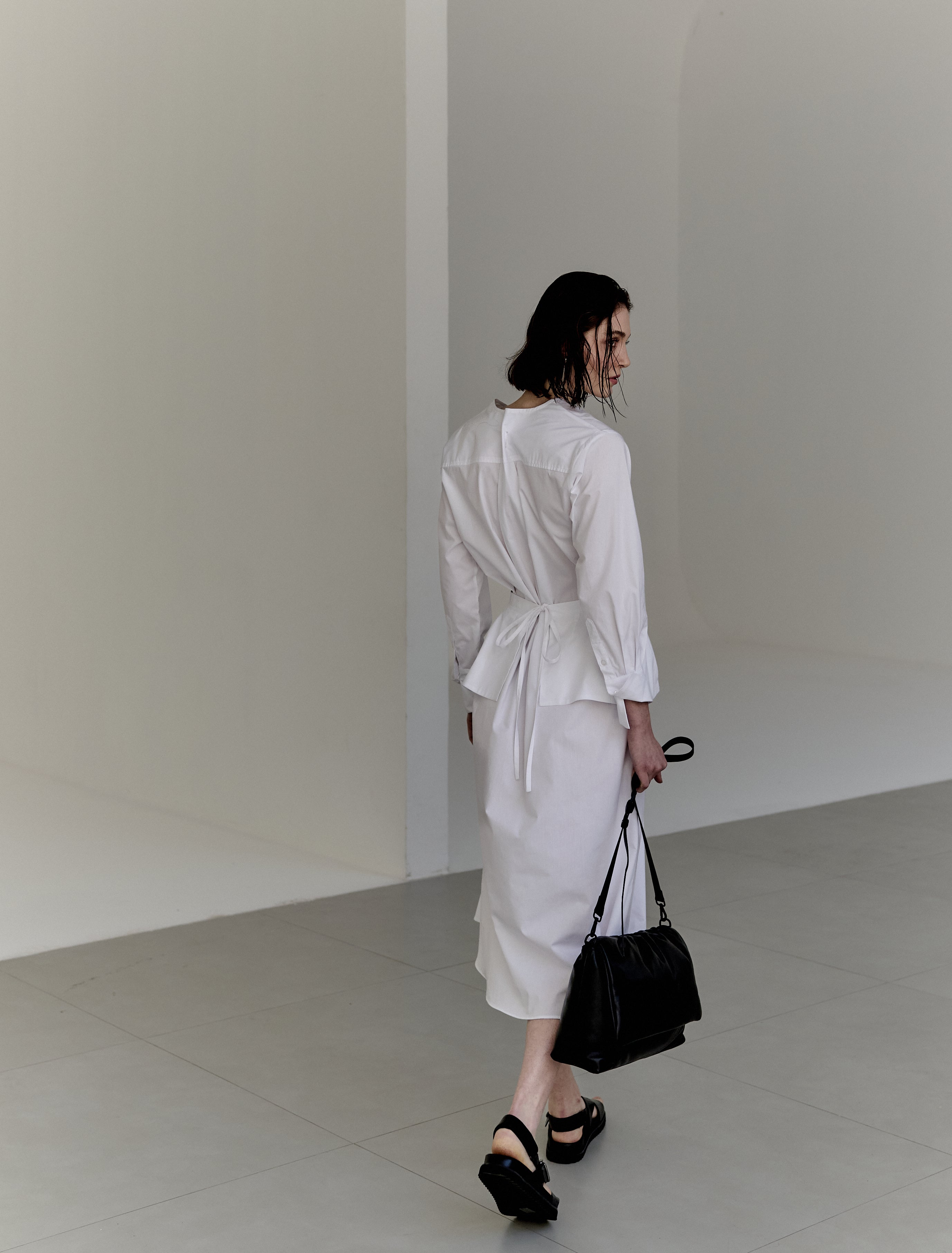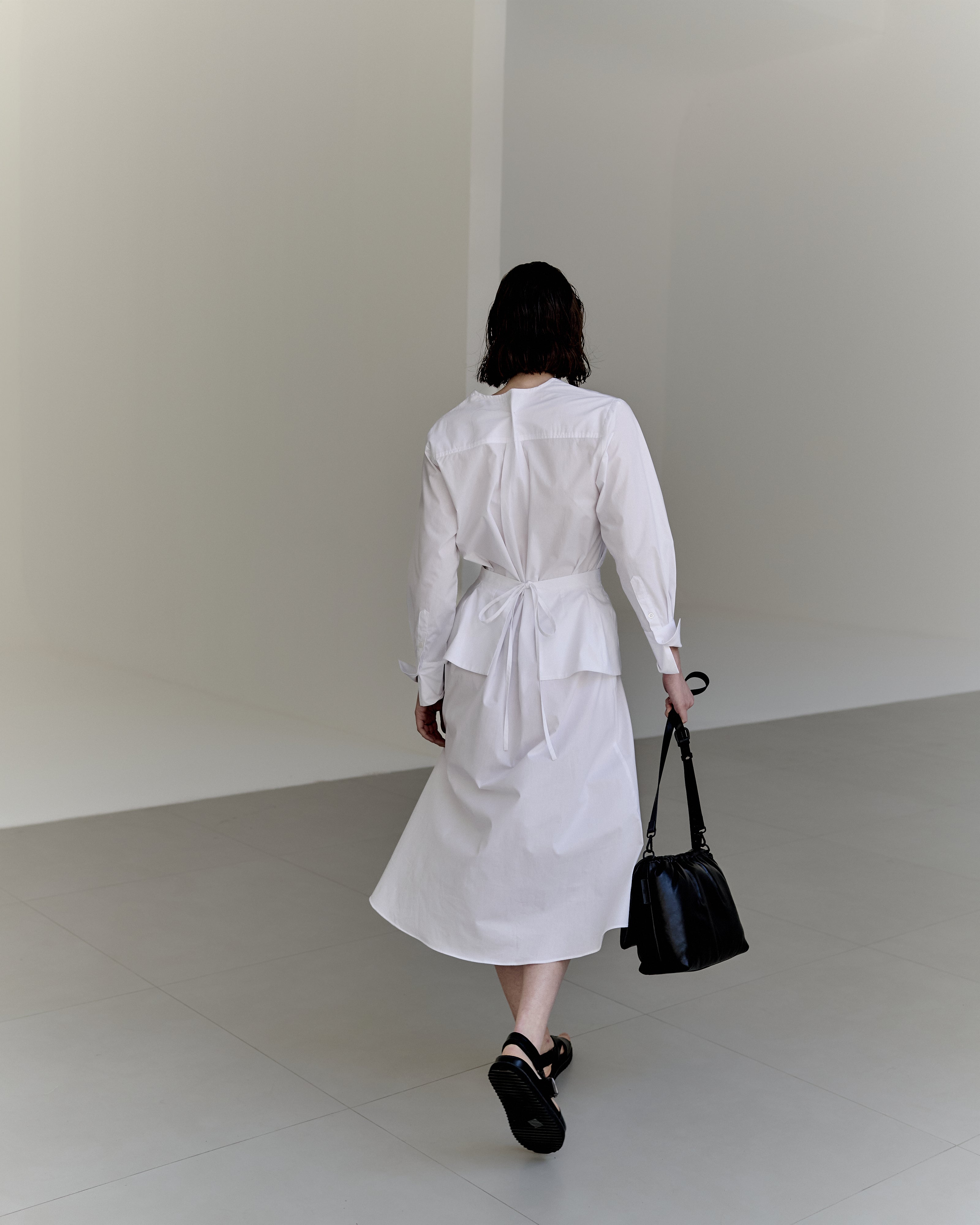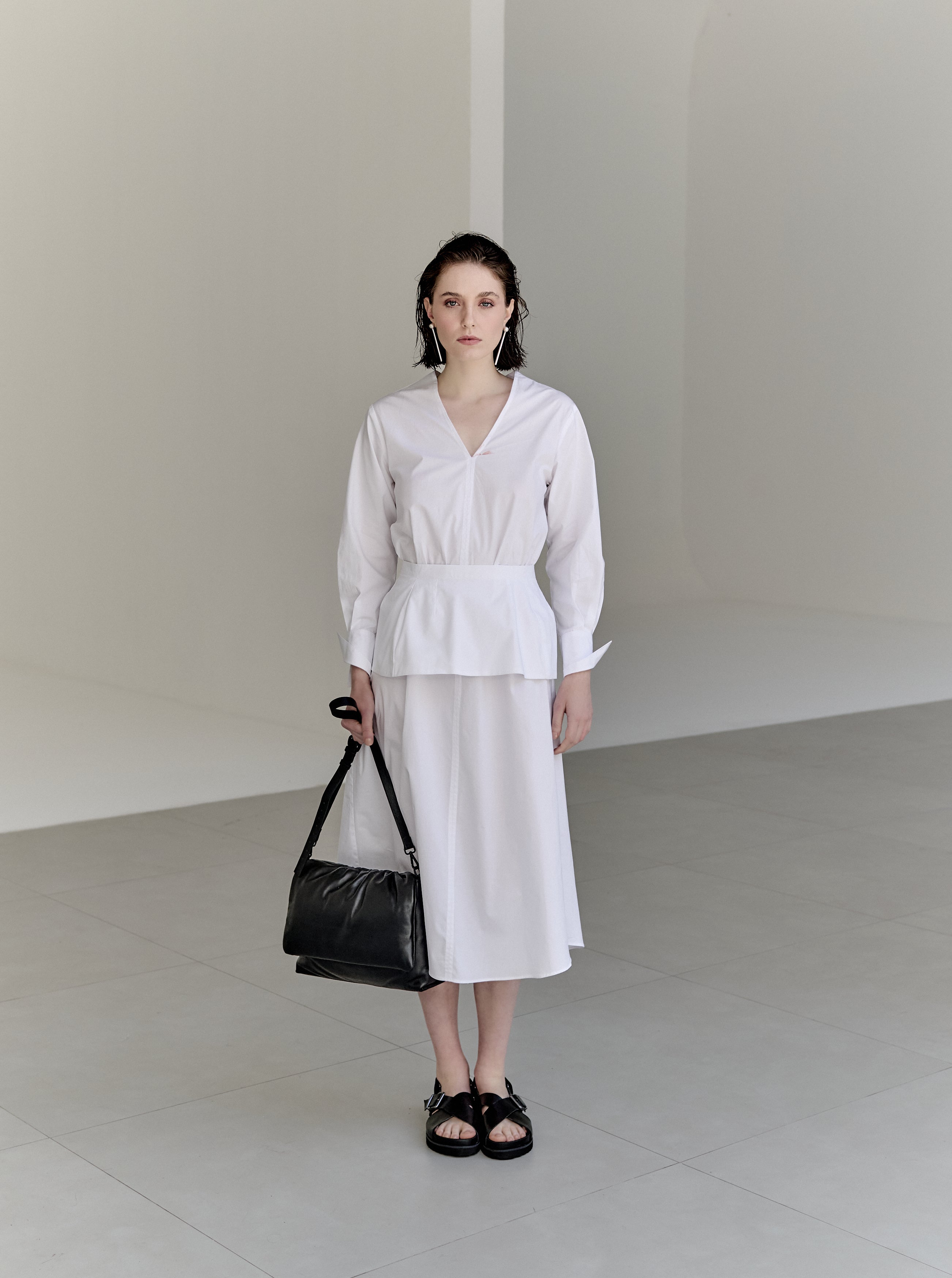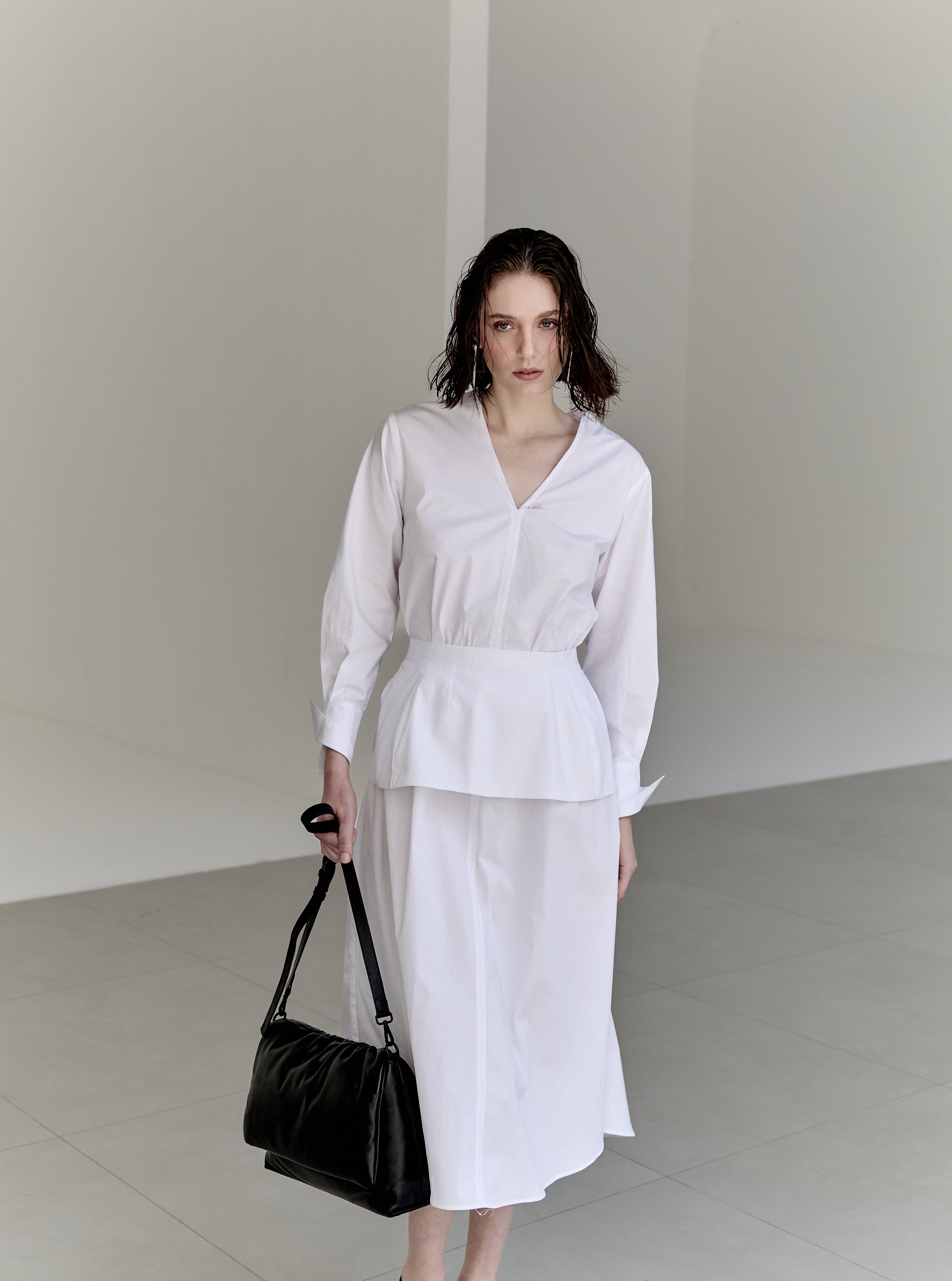 Vestido midi com decote em V e recorte vertical na frente. Possui pala nas costas com pregas e mangas finalizadas com punho. Acompanha basque para ser usada como sobreposição